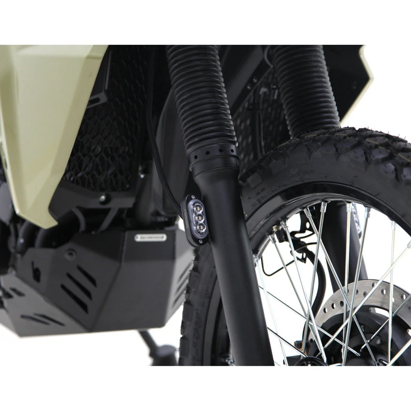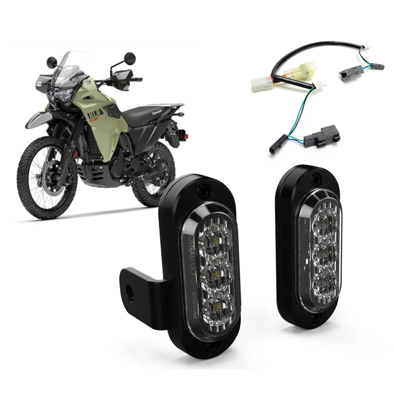 Denali’s LAH.08.11000 Plug-&-Play Fork Mounted T3 Turn Signal Kit is made specifically for Kawasaki KLR650 (2022-current).