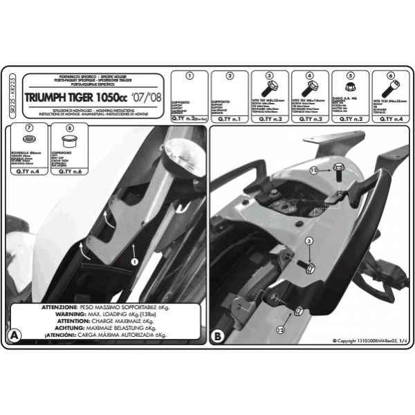 GIVI’s SR225 Specific Rack is made specifically for Triumph Tiger 1050 (2007-2012).