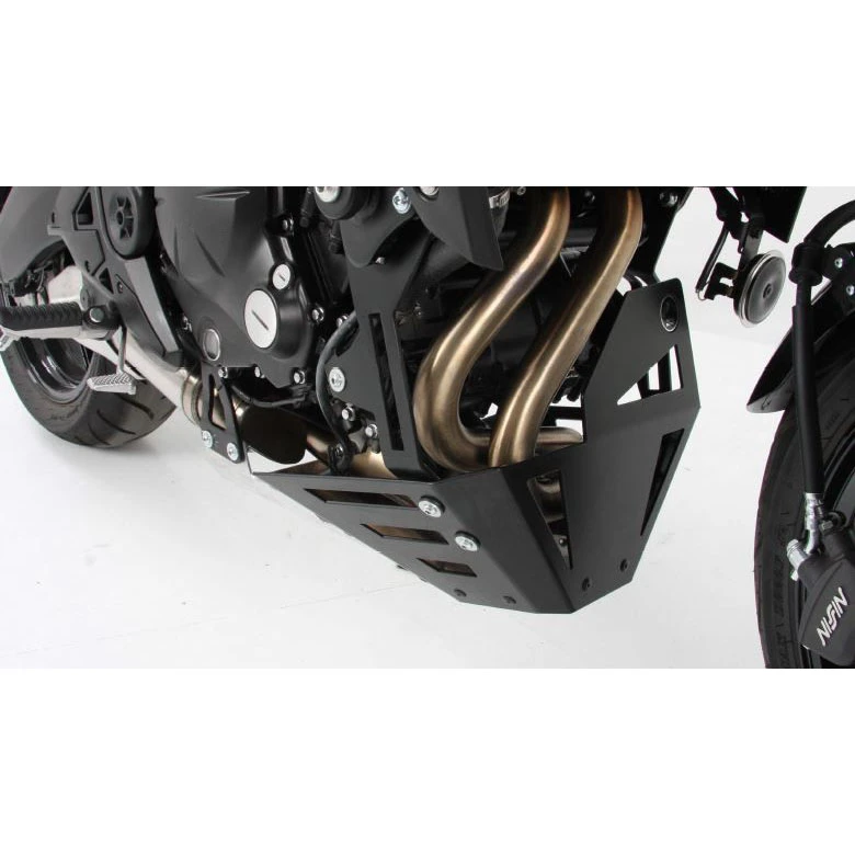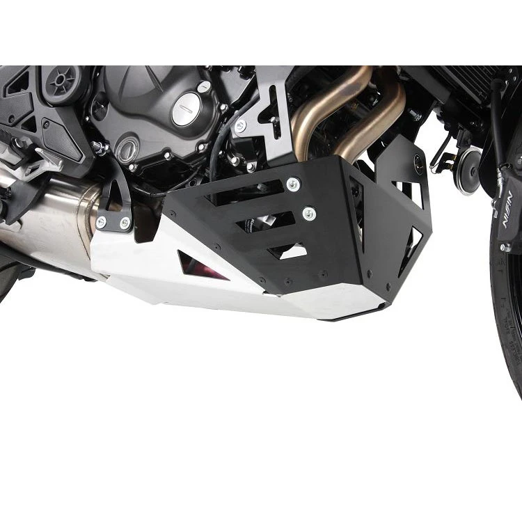 Hepco & Becker’s 810.2522 00 09 Engine Skid Plate, Aluminum is made specifically for Kawasaki Versys 650 (2015-current). This plate is designed to protect the underside of your motorcycle without compromising the design or functionality. All skid plates have their own carefully designed mounts that will ensure shocks are absorbed by the skid plate first. Made from 5mm thick aircraft grade aluminum.