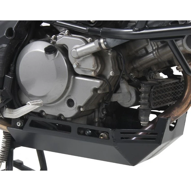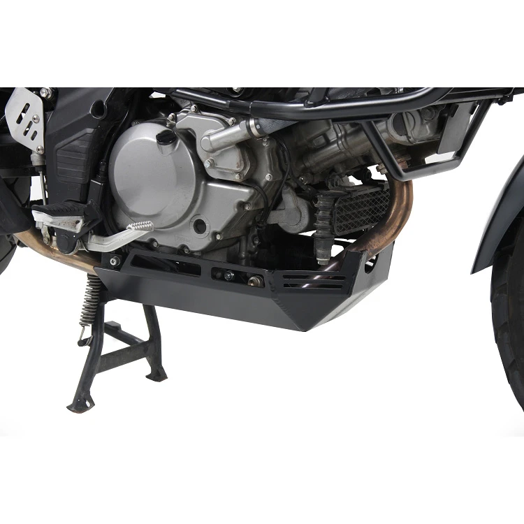 Hepco & Becker’s 810.3528 00 01 Engine Skid Plate, Black is made specifically for Suzuki DL650 V-Strom (2012-current). This plate is designed to protect the underside of your motorcycle without compromising the design or functionality. All skid plates have their own carefully designed mounts that will ensure shocks are absorbed by the skid plate first. Made from 5mm thick aircraft grade aluminum. Has 3 mounting brackets and points. If the skid plate is hit hard, the stress will immediately transfer to the brackets versus the engine.