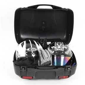 The new Junior 55 top case. The classic design from Hepco & Becker has been updated to modern styling. This case remains one of the toughest and yet elegant available today. Virtually unbreakable featuring a double walled shell made of highly impact resistant material absorbs impacts and falls. Thanks to a special seal, the bags are watertight allowing for the most grueling conditions. Available in 3 different styles being solid black, gloss black, and silver. The largest Hepco & Becker case available providing 55 liters of room and enough space for two full sized helmets. The top case can also be fitted with additional items such as a top case railing for additional storage as well as a backrest and inner bag.