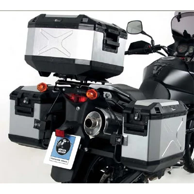 The elegant and rugged Xplorer cases have become one of Hepco & Becker’s top selling products since being introduced only a couple years ago. They are made of 1.5 mm thick anodized aluminum and ABS plastic to combine the best of both worlds. The aluminum has been anodized to prevent corrosion especially when putting wet items in the case. The plastic has been designed to absorb impacts. The angled structure of the cases provide for enhanced strength and durability. A clever lid hinge makes it so that you can remove the lid completely if needed making this is a top loader case that folds up to 90° for maximum access. Tie down points are molded into the top of the case allowing for additional attachment of H&B top bags or other luggage.